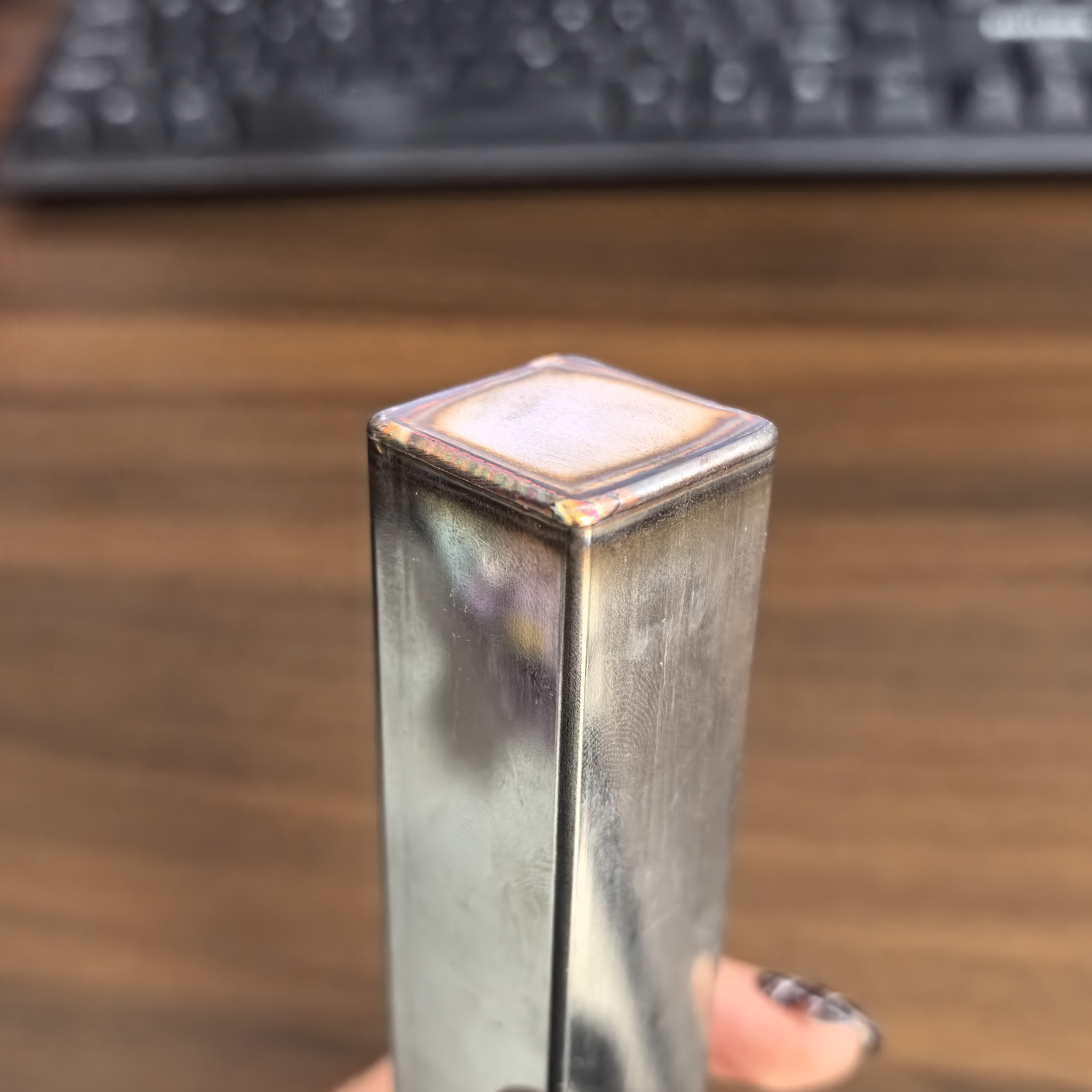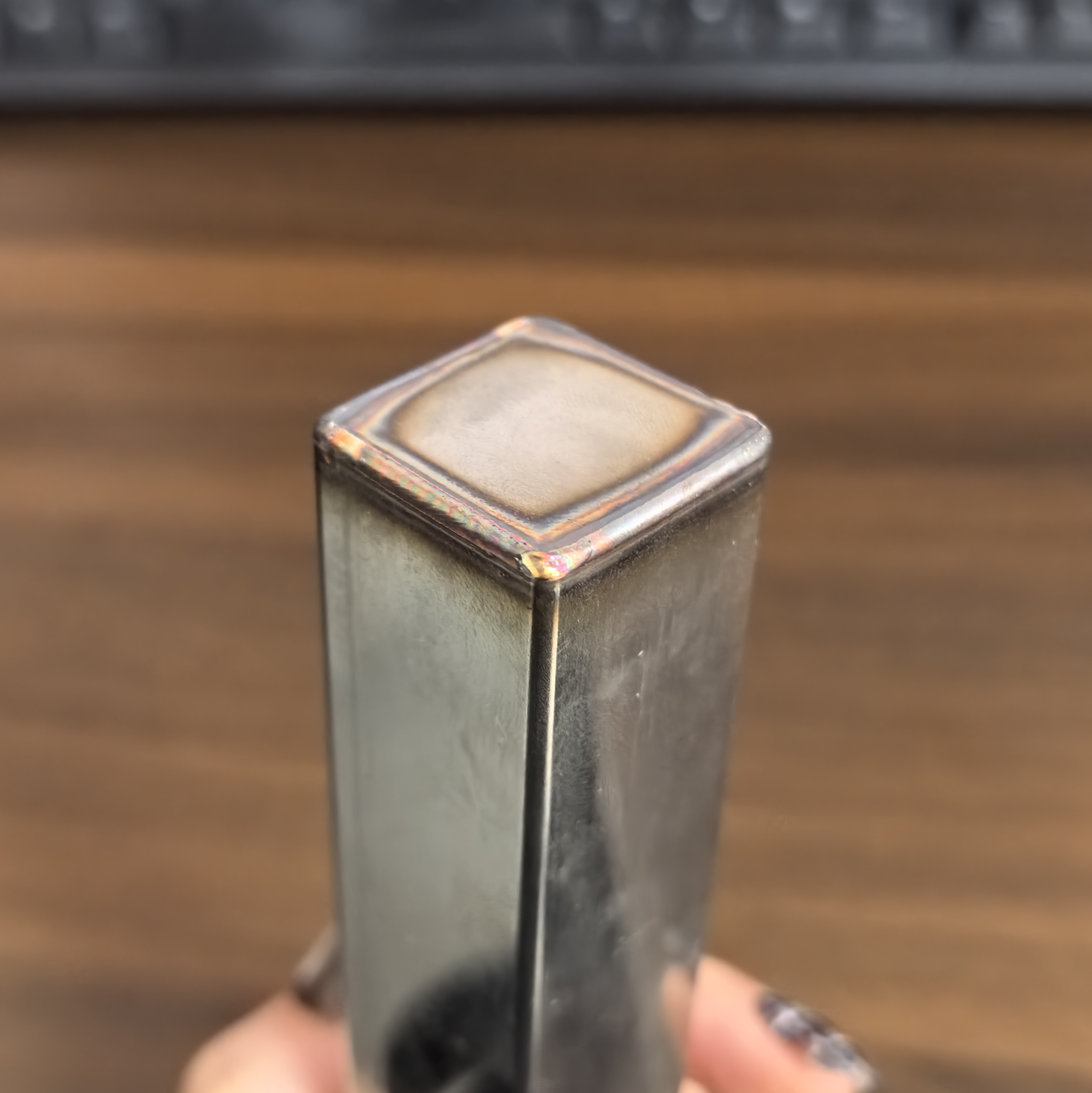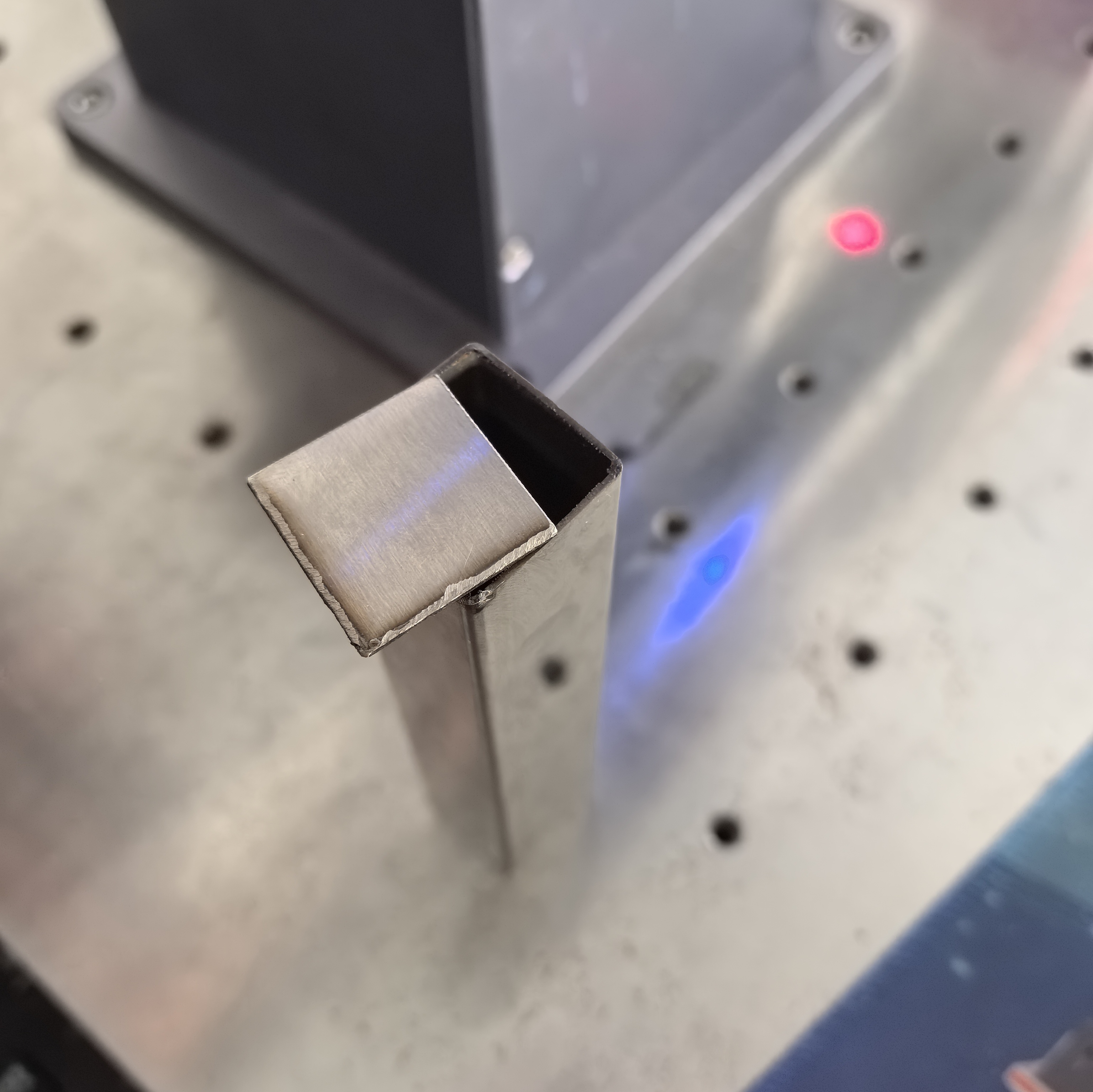 In this sample, a flat metal plate is welded onto the open end of a square tube, forming a continuous closed seam around the perimeter. The focus of this demonstration is on: