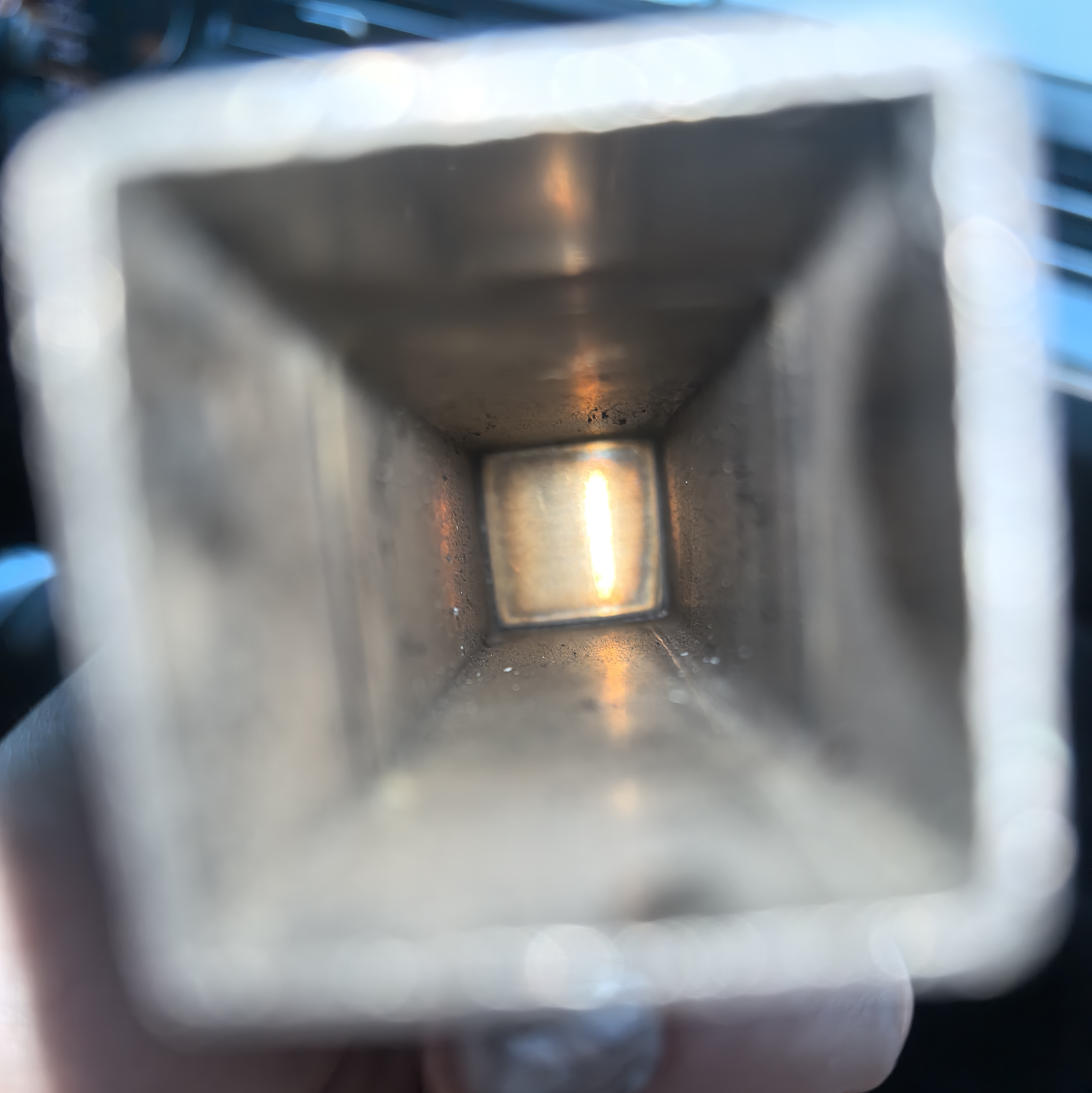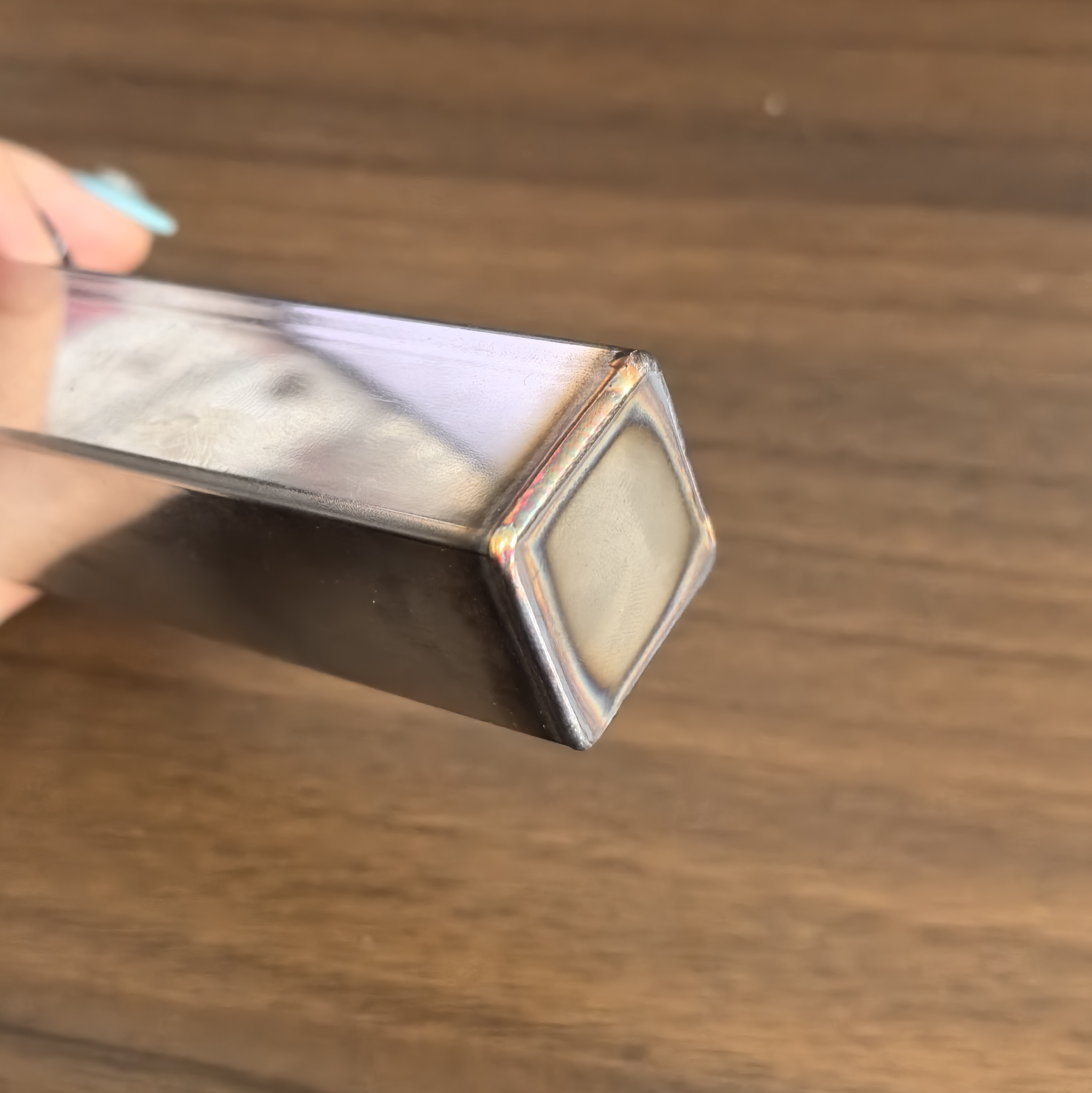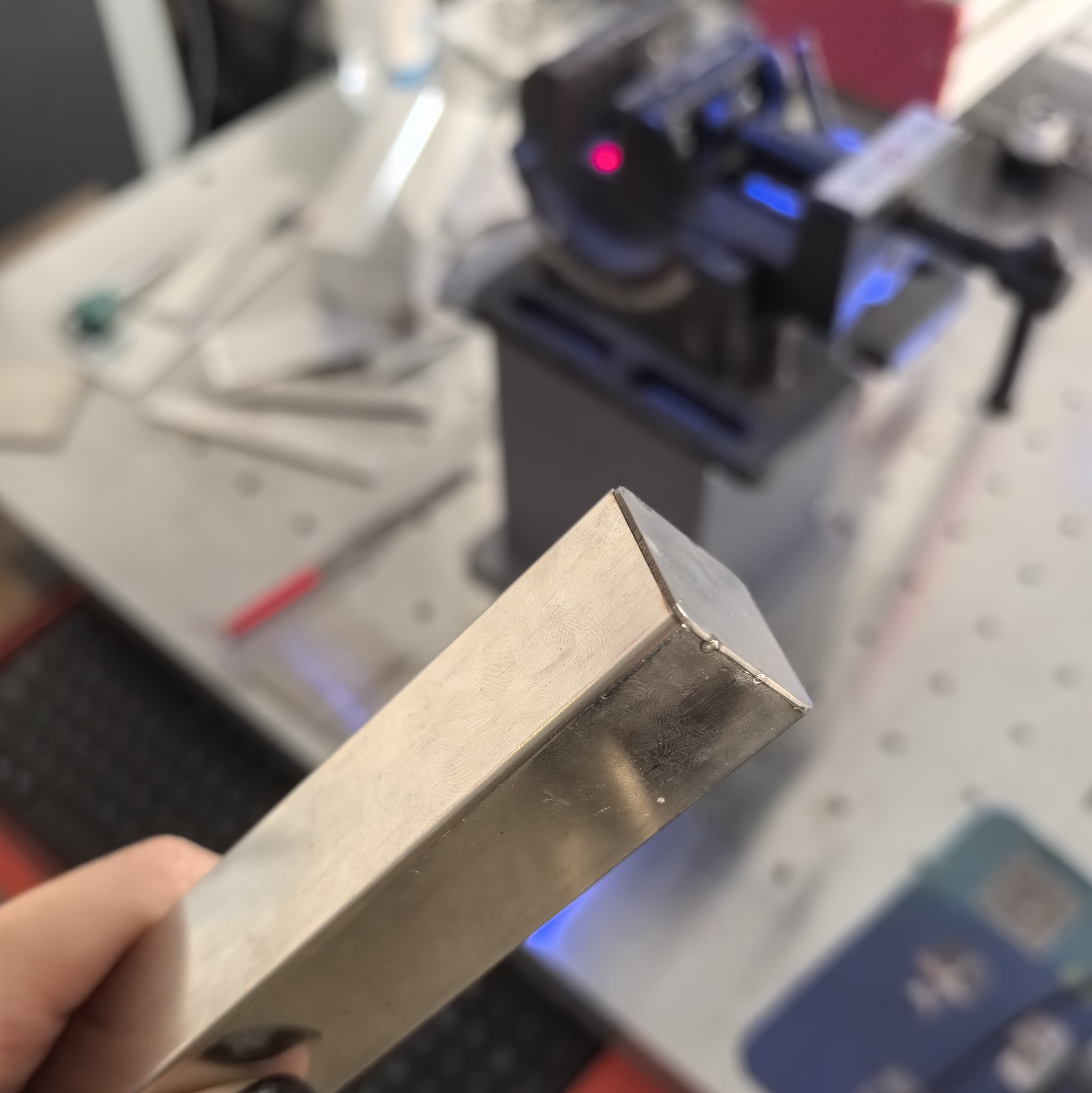 In this sample, a flat metal plate is welded onto the open end of a square tube, forming a continuous closed seam around the perimeter. The focus of this demonstration is on:
