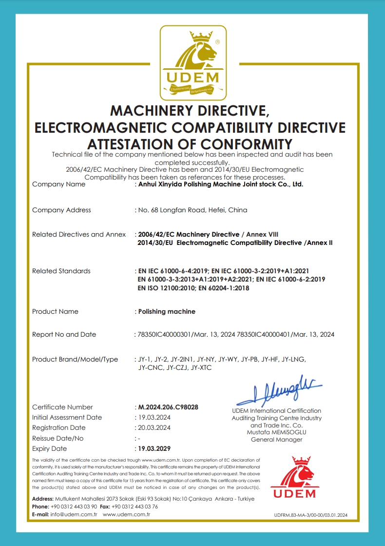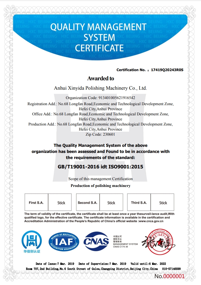 Company ProfileAnhui Xinyida Polishing Machine Co, Ltd. was established in 2009. lt is the first national high-tech enterprisespecialized in the research, development, production, sales and technical service of mechanical polishingequipment in East China. lt has two independent brands: "Xingyi Polish”and “XinYiDa" . The company is locatedin Hefei Economic and Technological Development Zone, covering an area of 30 acres and 20 million RMB in fixedassets. The past five vears, the output value of scale enterprises annual growth rate of nearly 20%. with sales of 30million RMB. Main BusinessWe have first-class R8D technicians and R8D management system. lt is one of the most comprehensive R8Dteams in the polishing machine industry. The company has many senior engineers and has more than 15 years otindustry experience. The products have obtained more than 30 patents in the country and passed the examinationof the national quality inspection department. Professional service team provides you with excellent technicalservices. The main products are: dished end, tank polishing machine, CNC (environmental water polishing) polishincmachine, LNG passing polishing machine, PLC controlled flat polishing machine, round tube polishing machineindustrial polishing machine and etc. Advanced structure, reliable, non-polluting, high polishing efficiency, widelyused in medicine. food. clean water supply. chemica , LNG new enerav and other industries. Combining with domestic and international advanced mechanica polishing technology and continuousinnovation, we have developed a multi-functional grinding head (multi-directional rotation, water tossing, abrasivebelt, thousand impeller interchange) to meet different polishing requirements of customers, and the processinoorecision reaches Ras0.2um mirror effect. With CNC module, the equipment is adjustable in frequency, automaticclamping and automatic polishing to improve production efficiency and product quality, reduce overall cost ancreduce environmental pollution. Adhering to the belief that "Quality changes the world" , Xinyida will use 5%-7%of its sales revenue every year for research and development, and strive to build first-class products. The market share of products ranks among the top in China.With first-class product quality, the companies that contact us are mainly: Mechanical lndustry First Design andResearch lnstitute. American Chart (Chanazhou) lndustrial Co.. Ltd CIMC. Jianasu Huada centrifuge, Jianasu KehaiBio, Changzhou Langmai Clean Technology, Shanghai Dongfulong, GEA China, Shandong Weifang Fine EagleProducts are exported to Southeast Asia, South Asia, the Middle East, the Americas, Europe, Africa and otherregions, and have been favored by the majority of users Objectives & ProspectsCommitted to building the first brand of chinese polishing machine.The company upholds the enterprise spirit of "excellence", "integrity-based" business philosophy, clear marketpositioning, and constantly develop new products with high technology content and high added value. Focusing onthe mechanical polishing industry, we will use high-tech applications such as CNC technology, high-end machiningcenters. and network information technoloay to enhance product auality. enhance comprehensive competitivenessand serve our customers.